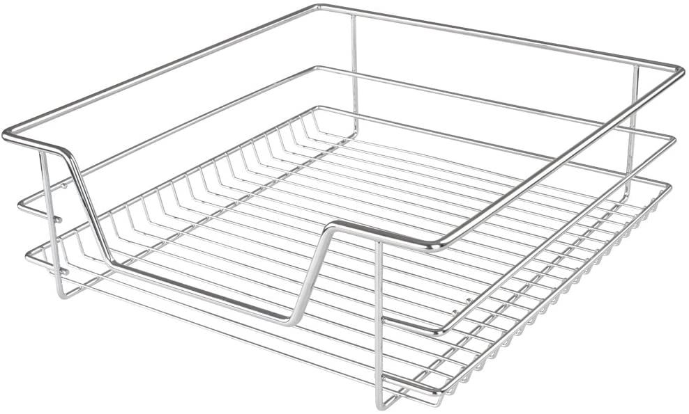 Tato zásuvka zajišťuje pořádek nejen v kuchyňské skříni, ale využití naleznete také v ložnici, v obývacím pokoji a mnoho jiné. Díky své teleskopické funkci ji lze snadno vytáhnout a zasunout zpět. Je zde prostor pro potraviny, domácí potřeby a mnoho dalšího. Naše zásuvky vyrobené z robustního pochromovaného kovu s maximální nosností 20 kg usnadní uspořádání předmětů v zásuvce. Technické údaje: vhodná pro skříňku: o šířce cca 50 cm rozměry bez lišt: 39,5 x 44 x 14 cm (š x h x v) rozměry včetně kolejnic: cca 46,2 (± 5 mm) x 44 x 14 cm (š x h x v) usnadňuje odkládání a vyjímání domácích potřeb materiál: chromovaný kov max. nosnost: 20 kg barva: stříbrná Obsah balení: 1 x zásuvka včetně montážního materiálu rozměry balení: 40,5 x 15 x 45 cm